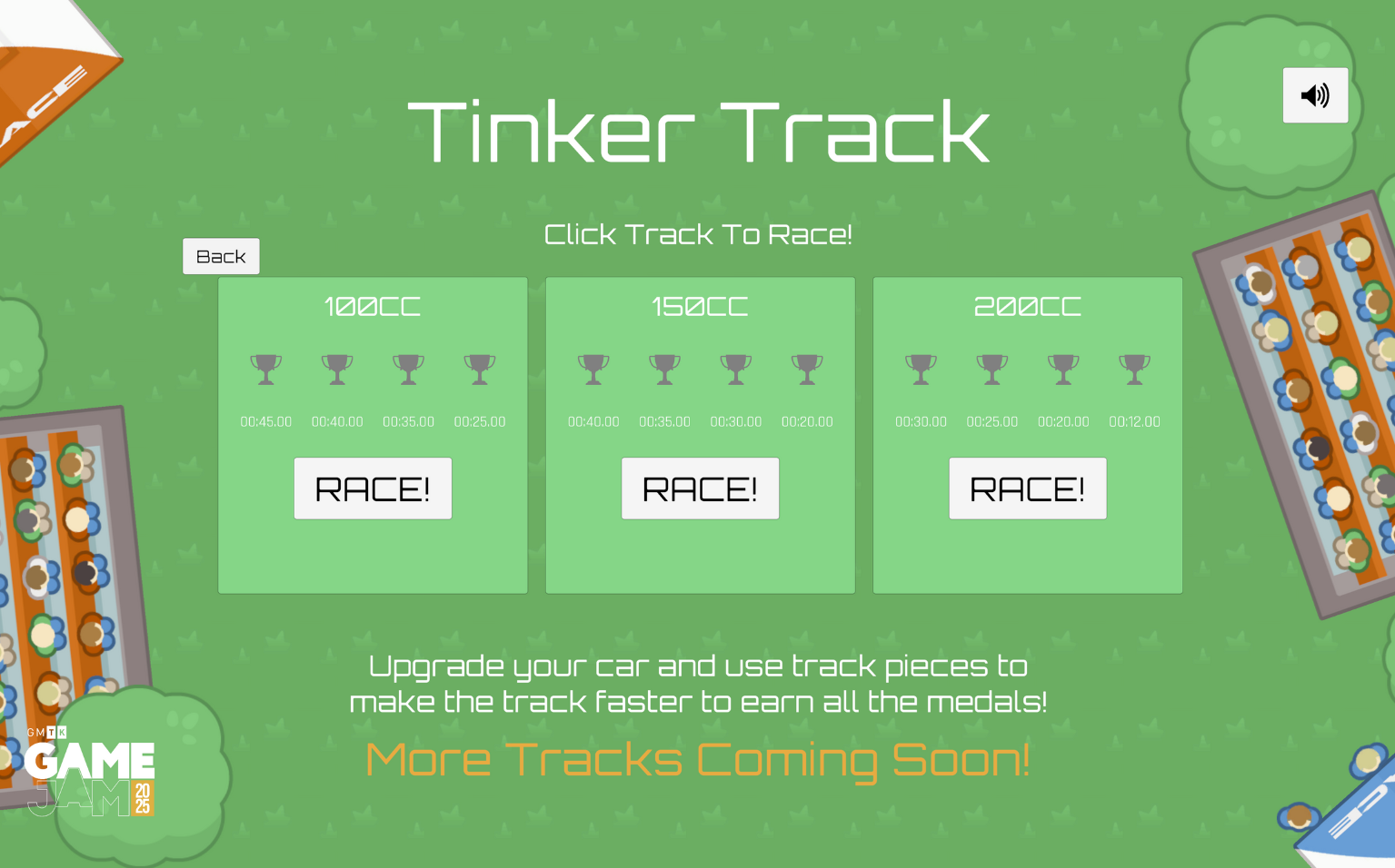 Race track game about finishing a race in a certain amount of time. You must craft the race track and upgrade your car to finish each cc and collect all the medals. Made in 3-4 days for the GMTK Game Jam 2025.